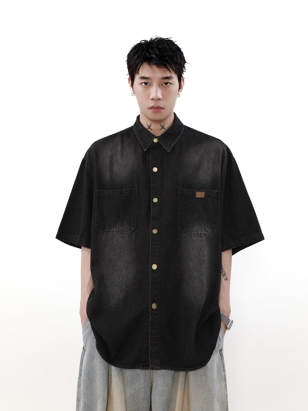 STAND COLLAR SHORT WASHED DENIM JACKET BEDES4533