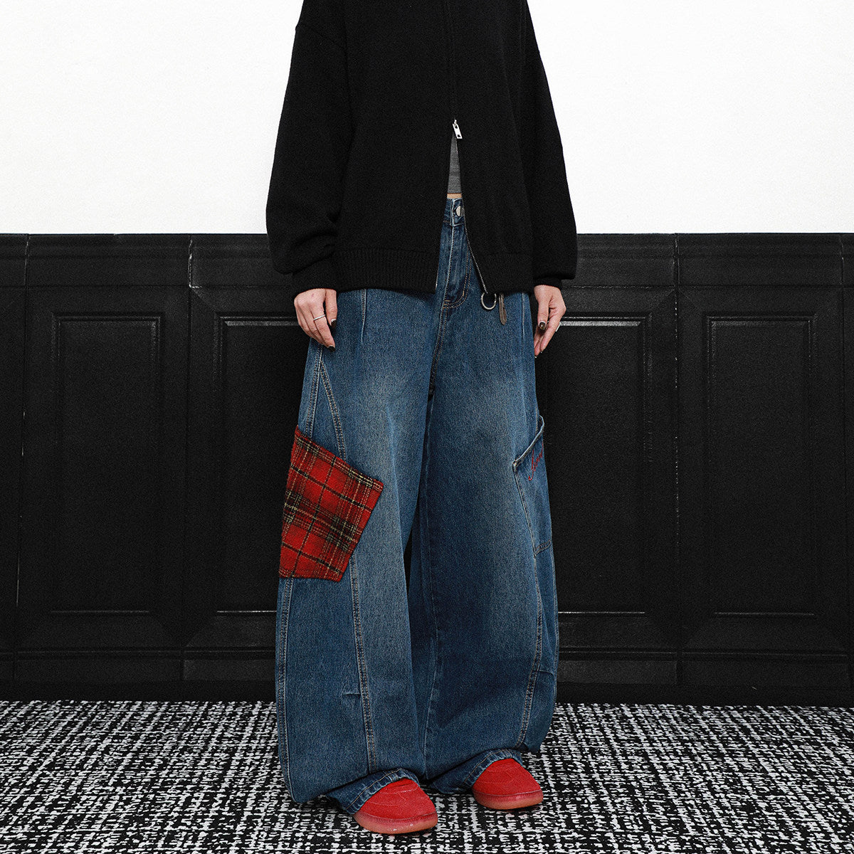 PLAID PATCH WIDE CURVE DENIM PANTS AEDES4579 - Deuku